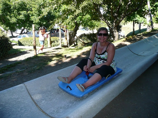 Al otro día fuimos a caminar por el otro lado de la ciudad y nos encontramos con una costanera muy bonita y una catedral espectacular hecha de piedra (lamentablemente muy rayada con spray). Fue una rica caminata. En la tarde fuimos caminando a Cerro Viejo, un cerro que estaba a 1 km. del centro. La gracia es que tenía telesilla, tobogán, confitería, bosque de arrayanes, bosque encantado de hadas y duendes, museo del ski, jardín botánico, etc, etc. Era muy chistoso, porque era un cerro chiquitito y como que todas estas cosas las habían puesto sólo para hacerlo más atractivo y justificar el precio de la entrada, que en todo caso era barata. Igual era chori el cerro. Tenía bonita vista, el tobogán igual era rico (aunque encuentro que Rodelbahn, del parque Mahuida, es mejor), el bosquecito de arrayanes era simpático, andar en telesilla siempre es una aventura (jaja) y con eso bastaba. ¿Para qué hacer un museo del ski mula y un bosque encantado desencantador? Bueno, igual la pasamos bien.