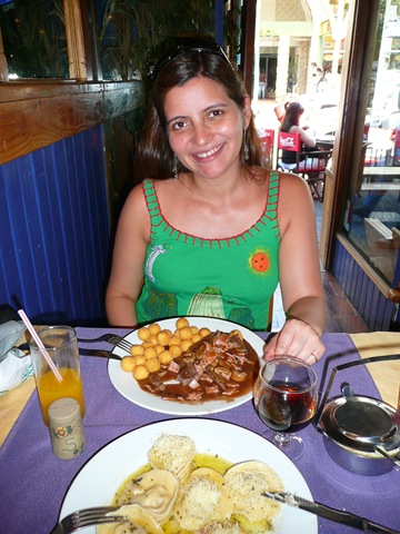 Después de dar unas vueltas y pasar por la oficina de turismo en busca de información, fuimos a la playa (de piedra, no de arena) y empezamos a ver dónde iríamos, porque no teníamos nada planificado. Así que lo primero que hicimos fue almorzar: la Andy y Santiago (que en esos días no tenía nombre) comieron Ciervo a la Cazadora y yo comí unos Tortelonis de Cordero en el Linguini. Mi plato estaba exquisito y el de la Andy prometía pero la carne de Ciervo la encontré seca, aunque tenía harta salsa seguramente para contrarrestar esa sensación.